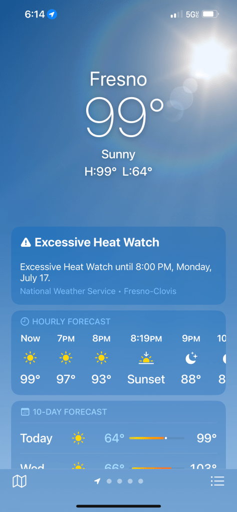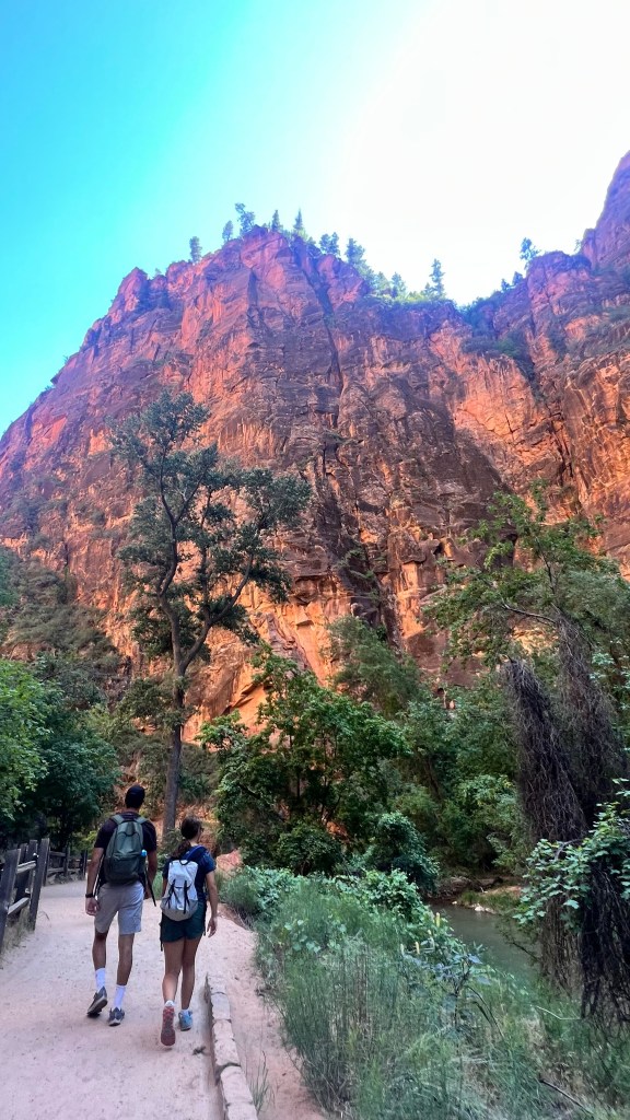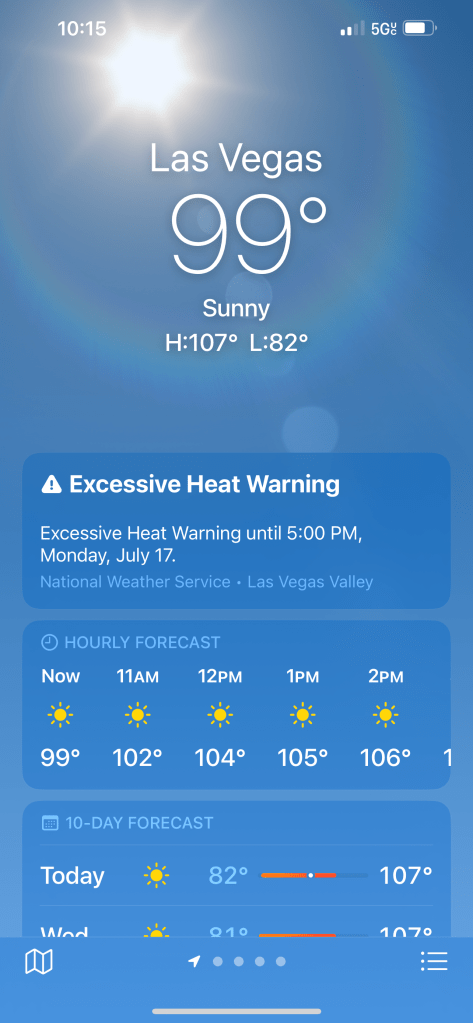 We had two nights booked at Zion NP but the national heat wave did us in. Last night we stayed in a hotel at St George and tonight in Las Vegas, giving us a head start to Yosemite tomorrow. We did make it to Zion, saw our camping sites and did two short hikes: Weeping Rock and Riverside Walk. Lastly, we made it into Las Vegas around 9pm.