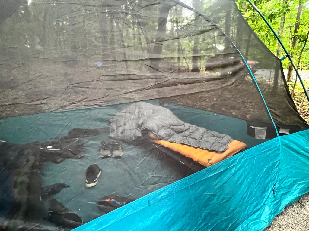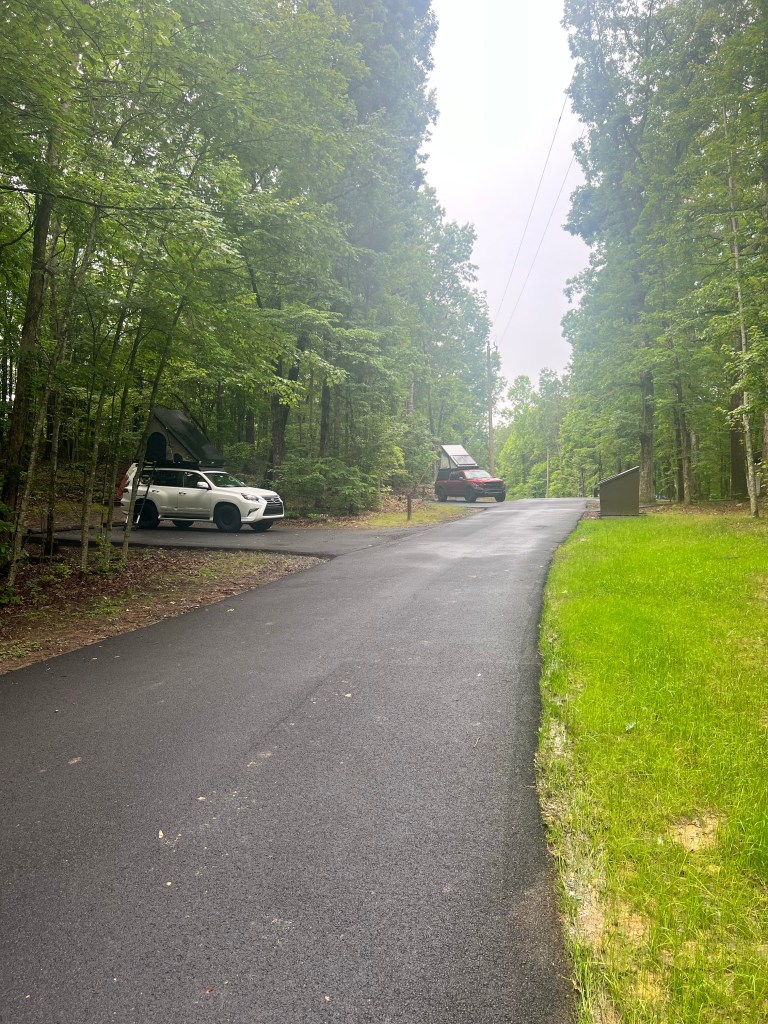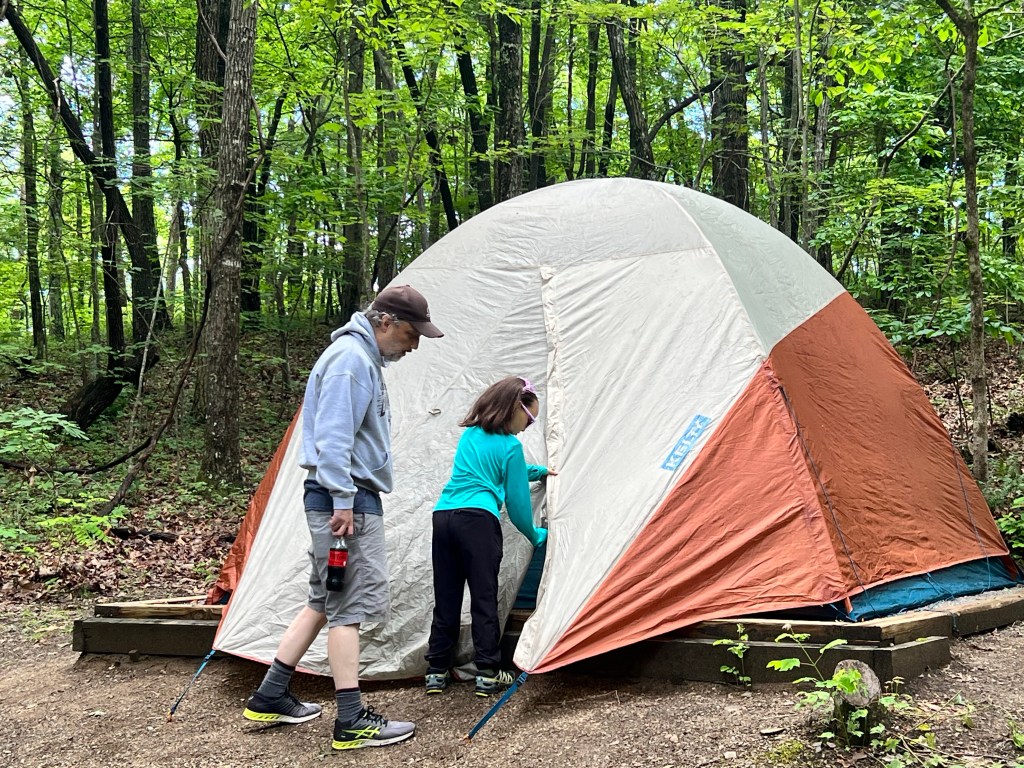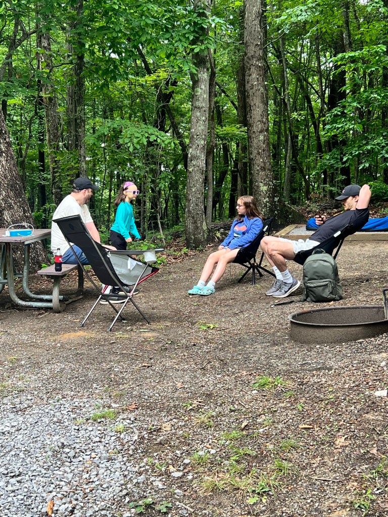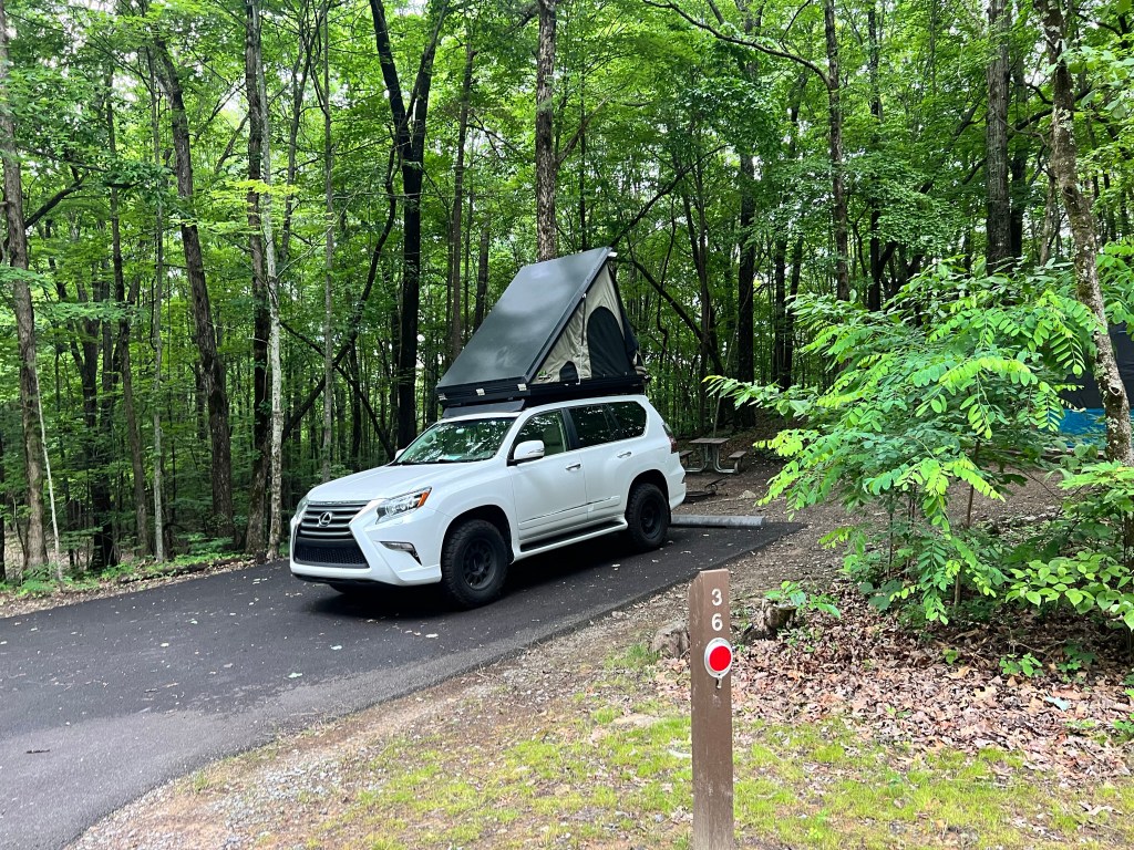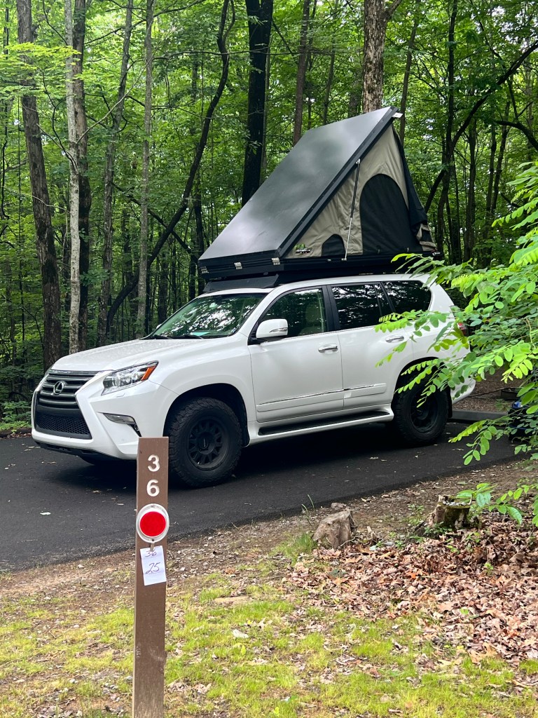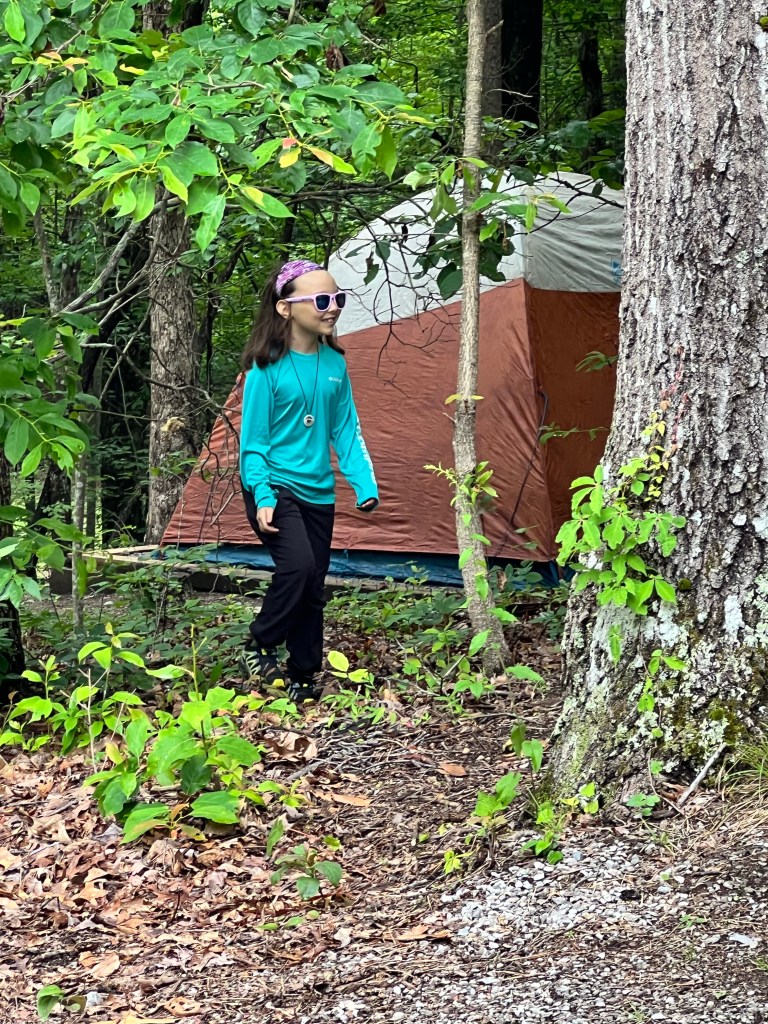 After a long drive and a delightful 11pm dinner at Denny’s (which was a FIRST for all of the girls) we finally made it to the campground in the Smokey Mountains at 4am. The camp sites here seem pretty well-spaced out, though the guy in the campsite next to us is snoring loud enough that we had to wonder if it was a bear. Erin and Ava are in the rooftop tent on the Lexus. Josie, Lucy, and I are in the Super Pacific. Ed and Rocco are on cots in the tent and Sam is going full-tilt with the camping experience and he’s off a bit on his own in a bivy. I hope I get up early enough to get a picture of that.